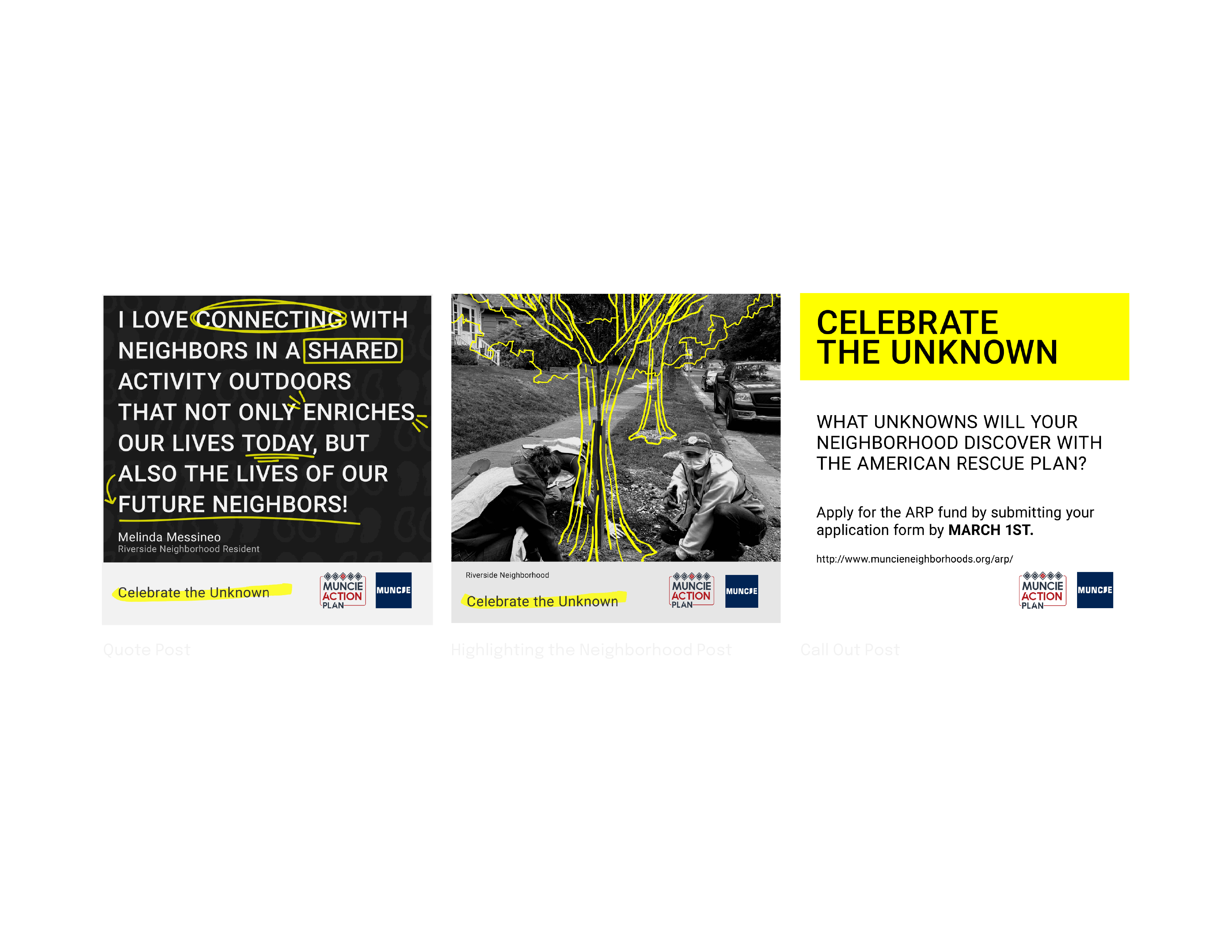 During my time as project manager at Studio 165+ our client, Building Better Neighborhoods (BBN) commisioned us to create posts to generate awareness about funding available to Muncie neighborhoods. The concept was based on “highlighting the unknown” and showcasing what neighborhoods have been doing to improve with grant money. My team created posts for multiple Munice neighborhoods that were to be posted on both Instagram and Facebook. This was a completely hands on experience that included creating and drafting concepts, editing images, drawing illustrations and coming up with a visually impactful final product.